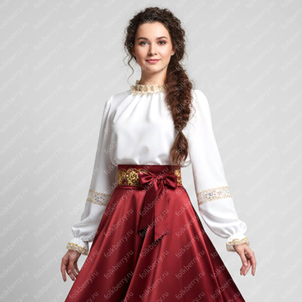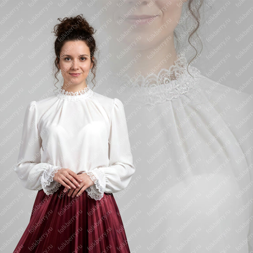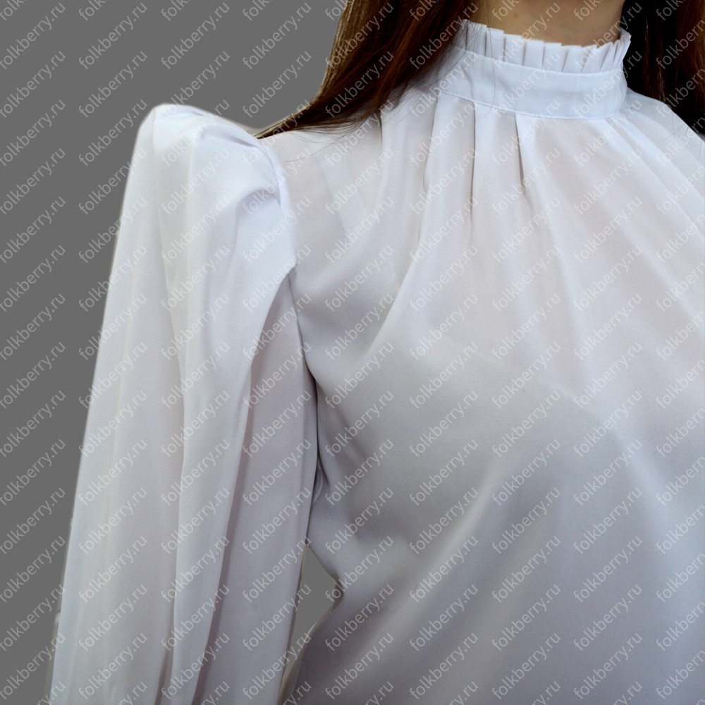 Блуза выполнена из белого шифона. Пышный рукав, по запястью волан. Декор золотистого или серебристого цвета.Для правильного размера напишите, пож-та, Ваш рост, окружность груди, ширину плеча и длину рукава.
