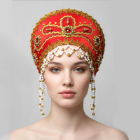 Кокошник выполнен на твёрдой основе, ткань – атлас (креп сатин), декорирован вьюном, тесьмой «завиток»,  а так же бусами, пайетками, и бисером, которые пришиты вручную. Высота изделия составляет над головой 12,5 см, ширина 27 см. Сзади кокошник крепится резинкой и атласной лентой, которая завязывается в бант. Возможно корпоративные сочетания цветов и нанесение Вашего логотипа.