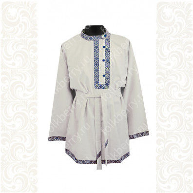 Косоворотка Оберег - сшита с учетом русских традиций (свободный силуэт, который не ограничивает движений; застежка сбоку, со стороны сердца; декор-оберег по горловине, груди, запястьям, поясу, бедрам, подмышечные полики, пояс-кушак). Ткань косоворотки - мягкий, плотный, дышащий небеленый лен светло-серого цвета. Декор благородного синего цвета с символами древне-славянских божеств. Такая косоворотка - ценный подарок для мальчика, мужчины к важным датам. Оберег - прекрасный вариант для детских праздников в школе и детском саду, театральных выступлений, православных мероприятий, для домашнего использования.