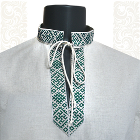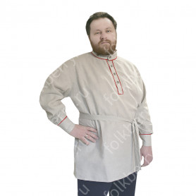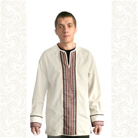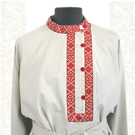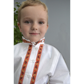 Косоворотка Русич выполнена из хлопка или габардина ( полиэстер 100%, одежная ткань) на выбор покупателя и декорирована жаккардовой тесьмой. Косоворотка в традиционном стиле, с поясом-кушаком, декор по горловине, груди, запястьям, талии, бедрам ( славяне наносили декор в тех местах, где бьется пульс). В декоре "зашиты" обережные символы здоровья, силы, удачи, процветания, принятые в Древней Руси. Декоративная тесьма смотрится очень эффектно, т. к. имеет четкий рисунок, напоминающий вышивку крестом.