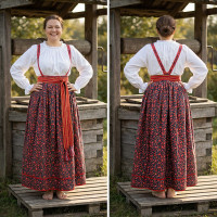 Выполненный в православном стиле сарафан с блузой «Костюм Воронежский» сшит из натурального хлопка в цветочек. Модель скромно декорирована однотонным воланом в цвет с основной тканью и тесьмой вьюнок. Можно носить под пояс и регулировать бретели по длине. Белая блузка из хлопка с длинным рукавом расшита натуральным нежным кружевом.