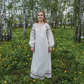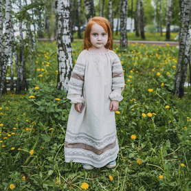 Платье «Дмитра» отрезное по талии, рукав реглан, юбка - почти солнце, длиной немного ниже колена. С поясом. Важно отметить, что декор платья выдержан в славянском стиле, но в целом, платье «Дмитра» - современное прочтение народных традиций. Как правило, дети и подростки с удовольствием выбирают его. Романтичное, удобное и нарядное, оно дарит ощущение радости и праздника. Замечательно подходит для тематических праздников в детских  учебных заведениях, по фасону и яркости цветов отлично подойдет для танцевальных коллективов. Платье выполнено из немнущейся, матовой ткани "габардин" символичных для славян цветов ( красного, синего, зеленого, бордового).