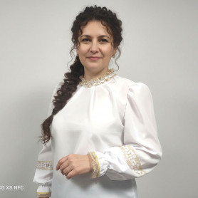 Платье сшито из яркого красного атласа и декорировано вставками с рисунком «хохлома». Юбка фасон полтора «солнца», подол и горловина украшены белым кружевом и тесьмой. Рукава «фонарики» сделаны из легкой, белой органзы.