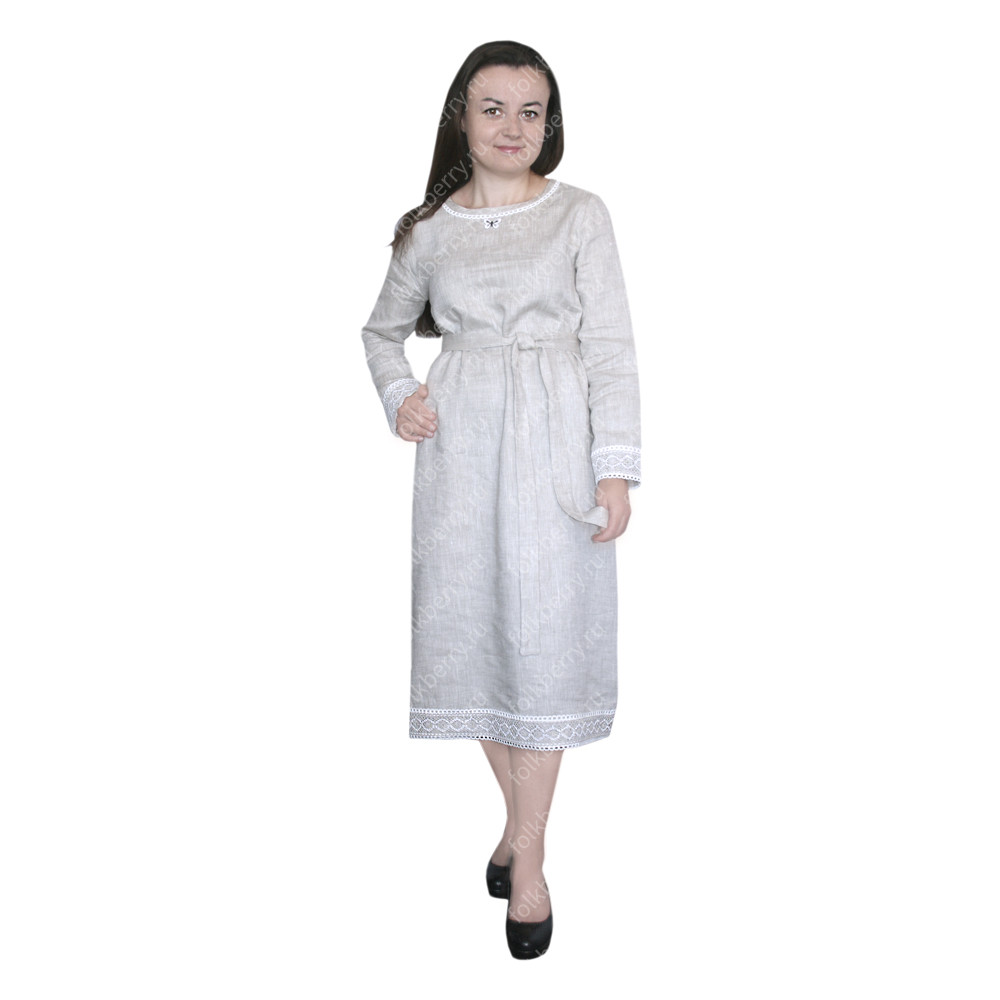 Выполненное из натурального мягкого льна серебристого цвета платье «Скандинавия» декорировано натуральными кружевами и вышивкой ручной работы (небольшая бабочка, закреплена на английской булавке).