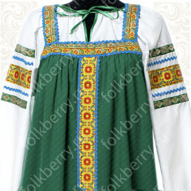 Материал: лен – 70%, хлопок – 30%. Ткань качественная, хорошей плотности, не просвечивает, красивого цвета. Возможны комбинированные модели, со вставкой, отличающейся по цвету, и машинной вышивкой.