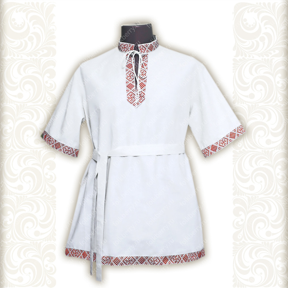 Рубаха мужская «Истоки» с коротким, втачным рукавом выполнена из белого льна. Ворот, рукава, низ изделия оснащены декором из жаккардовой тесьмы с традиционными славянскими обережными узорами. Модель комплектуется поясом (кушаком) из ткани с тесьмой.