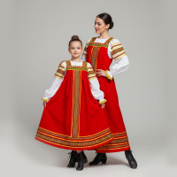 Выполненный в православном стиле сарафан с блузой «Русь» сшит из натурального хлопка в цветочек. Модель скромно декорирована однотонным воланом в цвет с основной тканью и тесьмой вьюнок. Можно носить под пояс и регулировать бретели по длине. Белая блузка из хлопка с длинным рукавом расшита натуральным нежным кружевом.