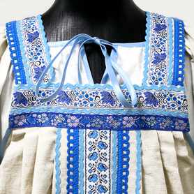 Сарафан с блузой «Гжель-2» – яркий наряд в духе народных традиций. Оригинальный дизайн, красивые оттенки синего, бирюзового, белого цветов, качественное исполнение комплекта порадуют Вас. Это хороший выбор для участников танцевально-театральных коллективов.